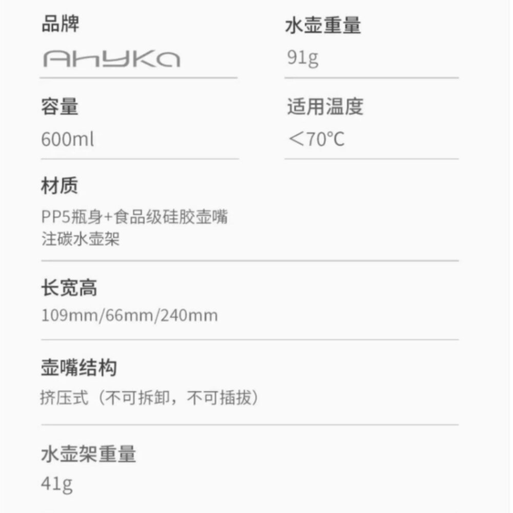 【AHYKA】噴射水瓶 商品介紹: 水壺重量:91g 容量:600ml 材質:PP5瓶身+食品級矽膠壺嘴 水壺架重量:41 水壺架材質:碳纖複合材質 附水壺架螺絲、杯刷 . ★下單後若發現缺貨,會再以聊聊通知喔★ ★出貨一律開立發票,安心有保障★ 如需統編請聊聊或備註喔 六日、國定假日期間,倉儲系統未營業,無法確認即時庫存狀況,還請您見諒 下單後一般3日內(不含例假日)即會為您出貨~