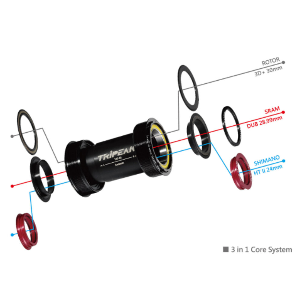 可以同時對應SHIMANO HTII 24mm,SRAM DUB 28.99mm,ROTOR 3D+ 30mm等三種不同大盤之心軸規格