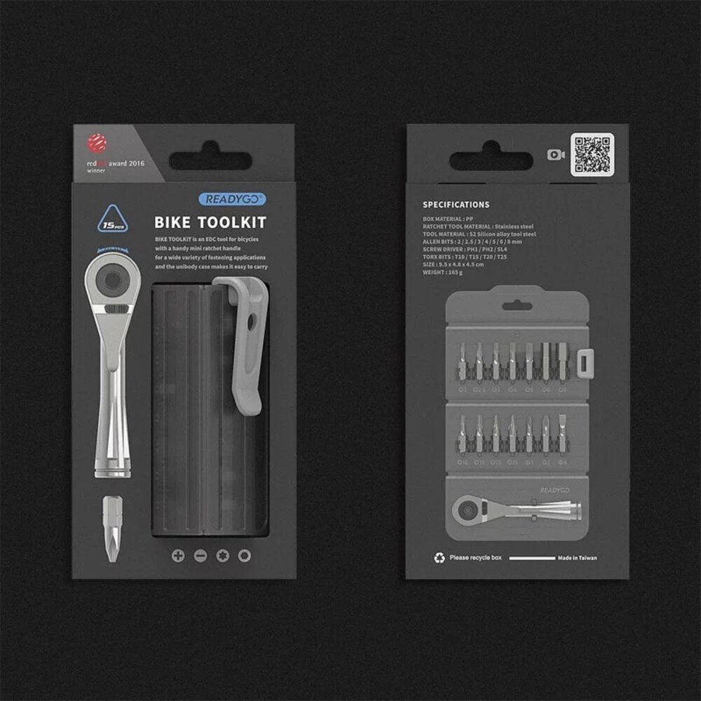 商品描述 BIKE TOOLKIT 迷你棘輪工具組 專為「單車生活」及「居家修繕」所設計 內含雙用棘輪扳手及單車常用規格起子頭 工具盒可展開吊掛於牆面 摺疊收納後體積迷你,腰掛設計便於攜帶 使用上方便直覺。