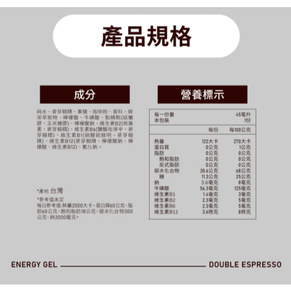純水、麥芽糊精、果糖、咖啡粉、香料、綠茶萃取物、檸檬酸、牛磺酸、黏稠劑(結蘭膠、玉米糖膠)、檸檬酸鈉、維生素B2(核黃素、麥芽糊精)、維生素B6(鹽酸吡哆辛、麥芽糊精)、維生素B1(硝酸硫胺明、麥芽糊精)、維生素B12(麥芽糊精、檸檬酸鈉、檸檬酸、維生素B12)、氯化鈉。