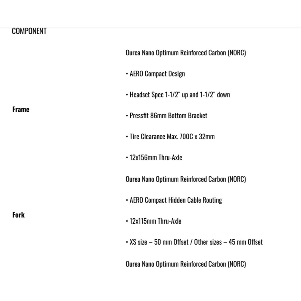 採用德國研發團隊獨家技術NORC Carbon的Ourea更是加入最頂階的Toray T1100G及其他不同的碳纖複材,在確保車架品質的同時也讓您的速度更優異,車架(size S含配件) 重775g。