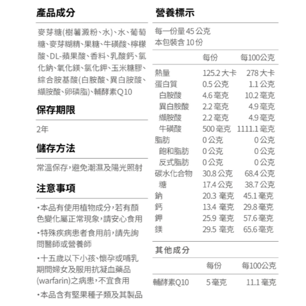 ・添加牛磺酸、BCAA及輔酶Q10:幫助增強體力耐力,促進運動恢復,並提升整體運動表現。