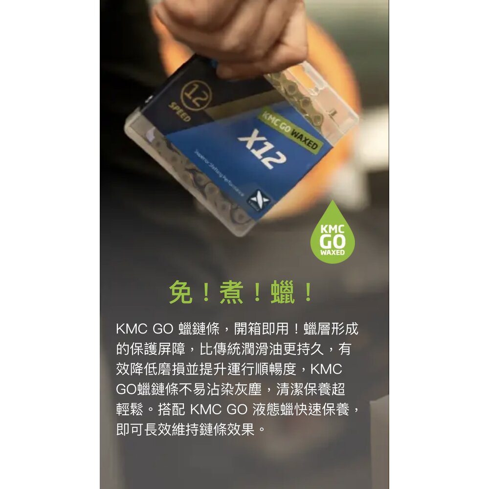 KMC GO 創新配方和特殊蠟處理製程,使鏈條提供高效踩踏並提升兩倍耐用性。