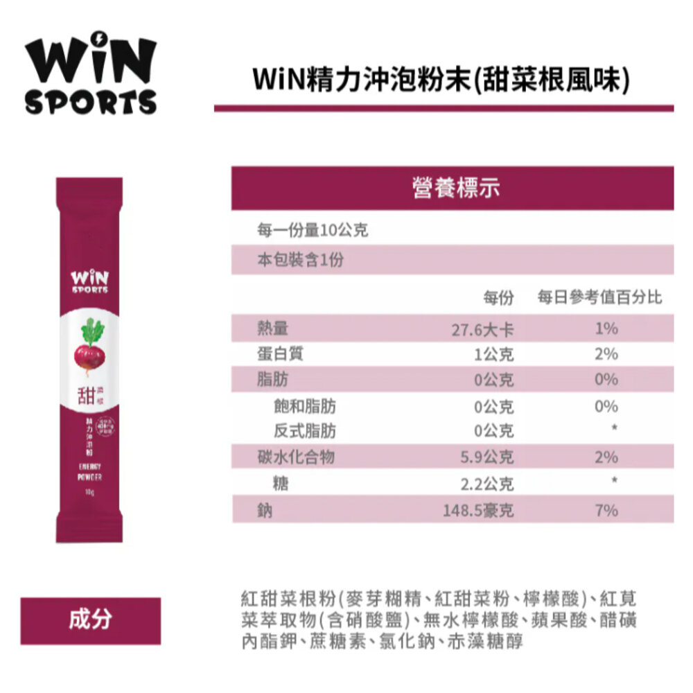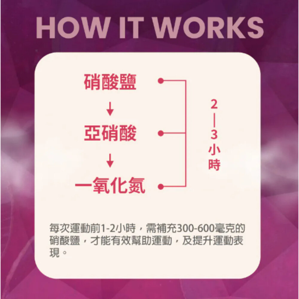 紅甜菜根粉(麥芽糊精、紅甜菜粉、檸檬酸)、紅莧菜萃取物(含硝酸鹽)、無水檸檬酸、蘋果酸、醋磺內酯鉀、蔗糖素、氯化鈉、赤藻糖醇。